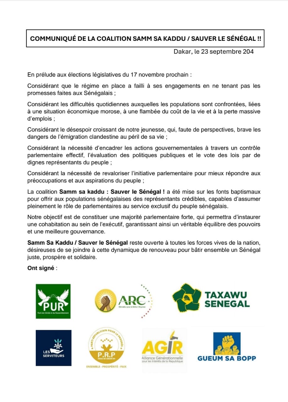 – À moins de deux mois des élections législatives du 17 novembre 2024, une nouvelle coalition politique voit le jour sous le nom de Samm Sa Kaddu : Sauver le Sénégal. Cette alliance ambitionne d’offrir une alternative crédible aux Sénégalais, en réponse aux multiples crises socio-économiques qui frappent le pays.